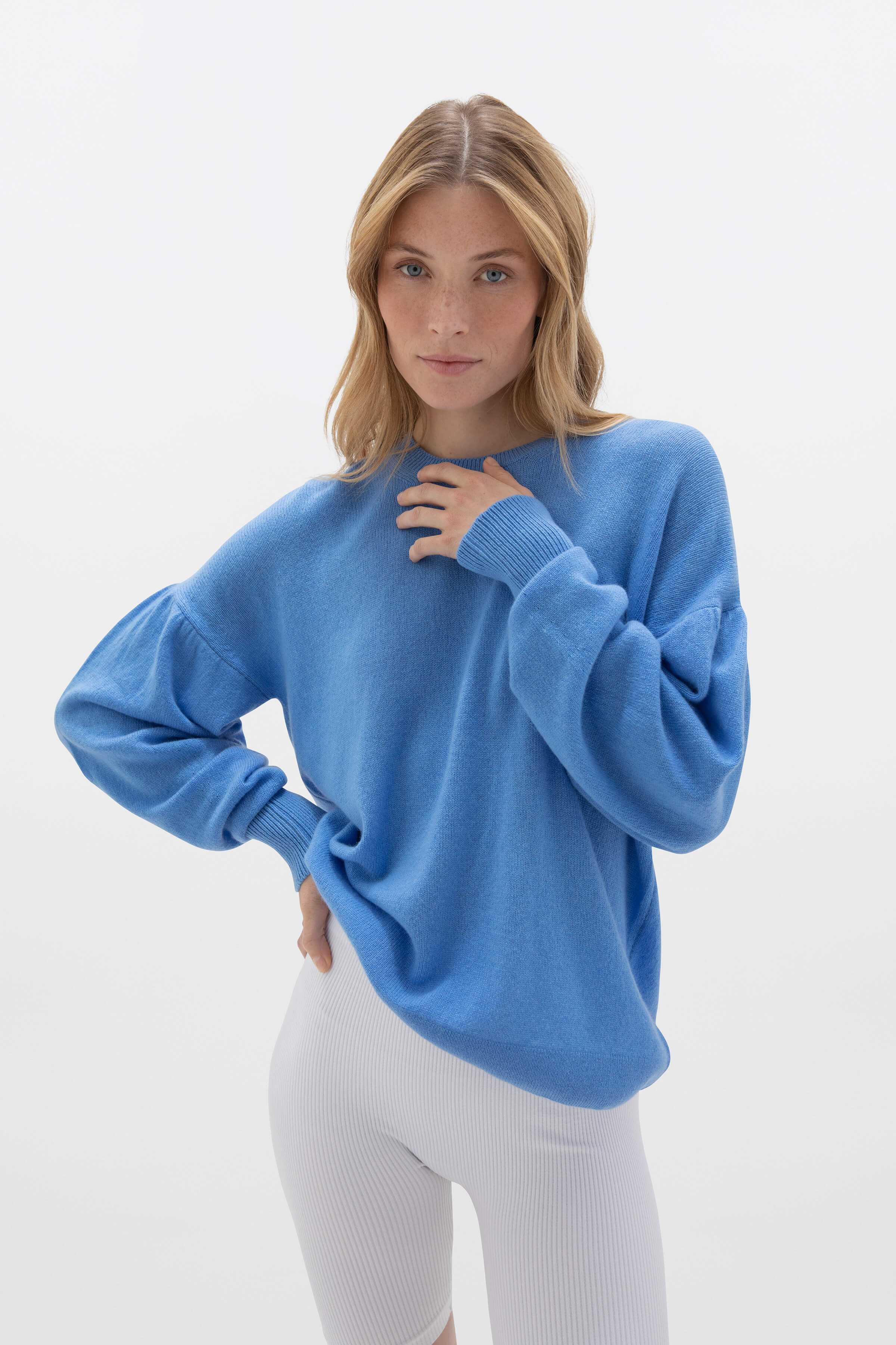 A simple, lightweight sweater in Skye Blue with full balloon-shaped sleeves and gathered details at the shoulders. Our gauzy Cashmere pieces are light and luxurious, the perfect additions to your holiday capsule. Easy to pack and effortless to wear.