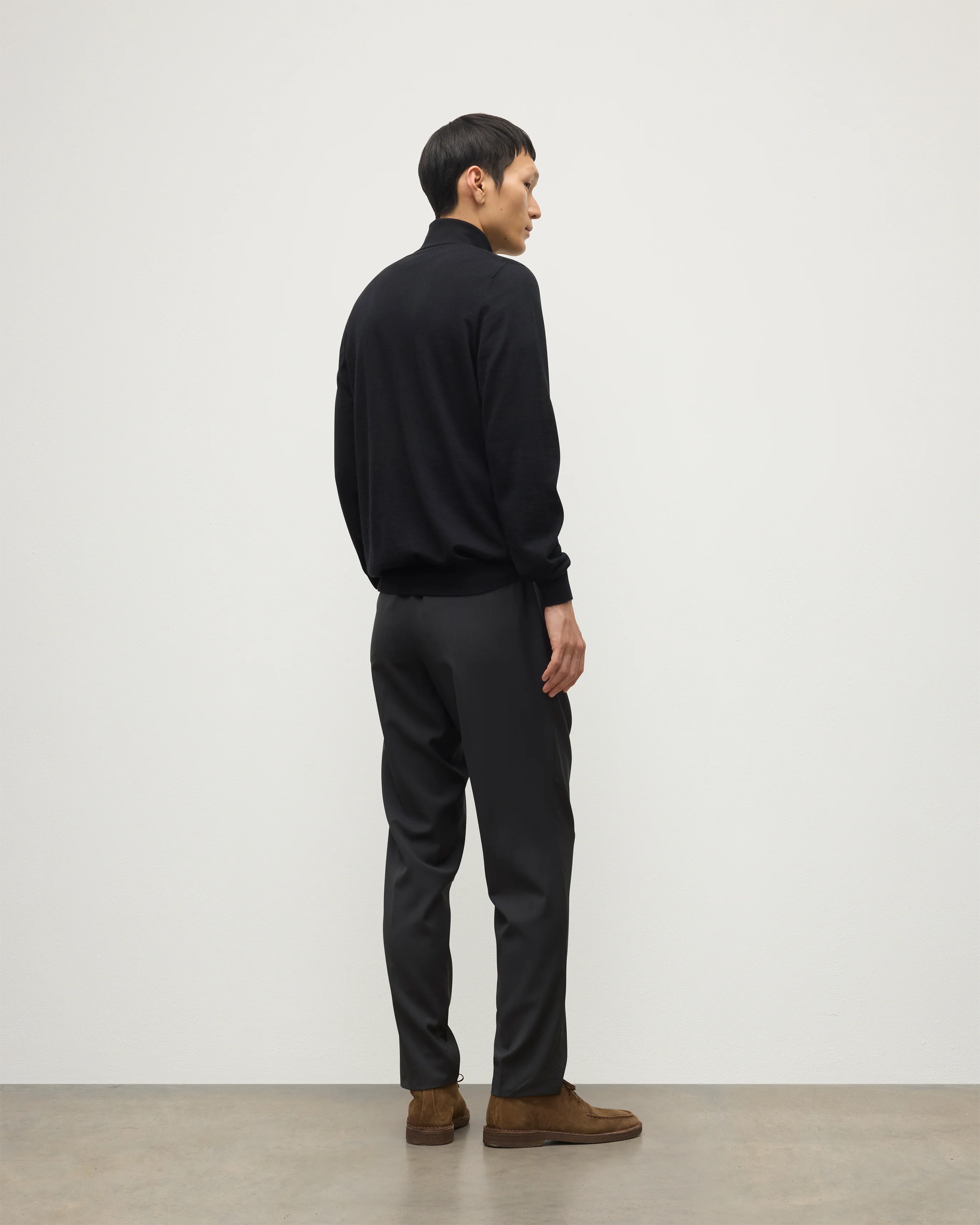 The Black Superfine Cashmere Roll Neck is a sleek, versatile essential designed for men. Its streamlined silhouette and classic roll-neck design make it the perfect trans-seasonal sweater to be worn next to the skin or as an underpinning for suiting. Its modern classic fit, fine rib on collar, cuffs, and hem make it the ultimate investment piece.