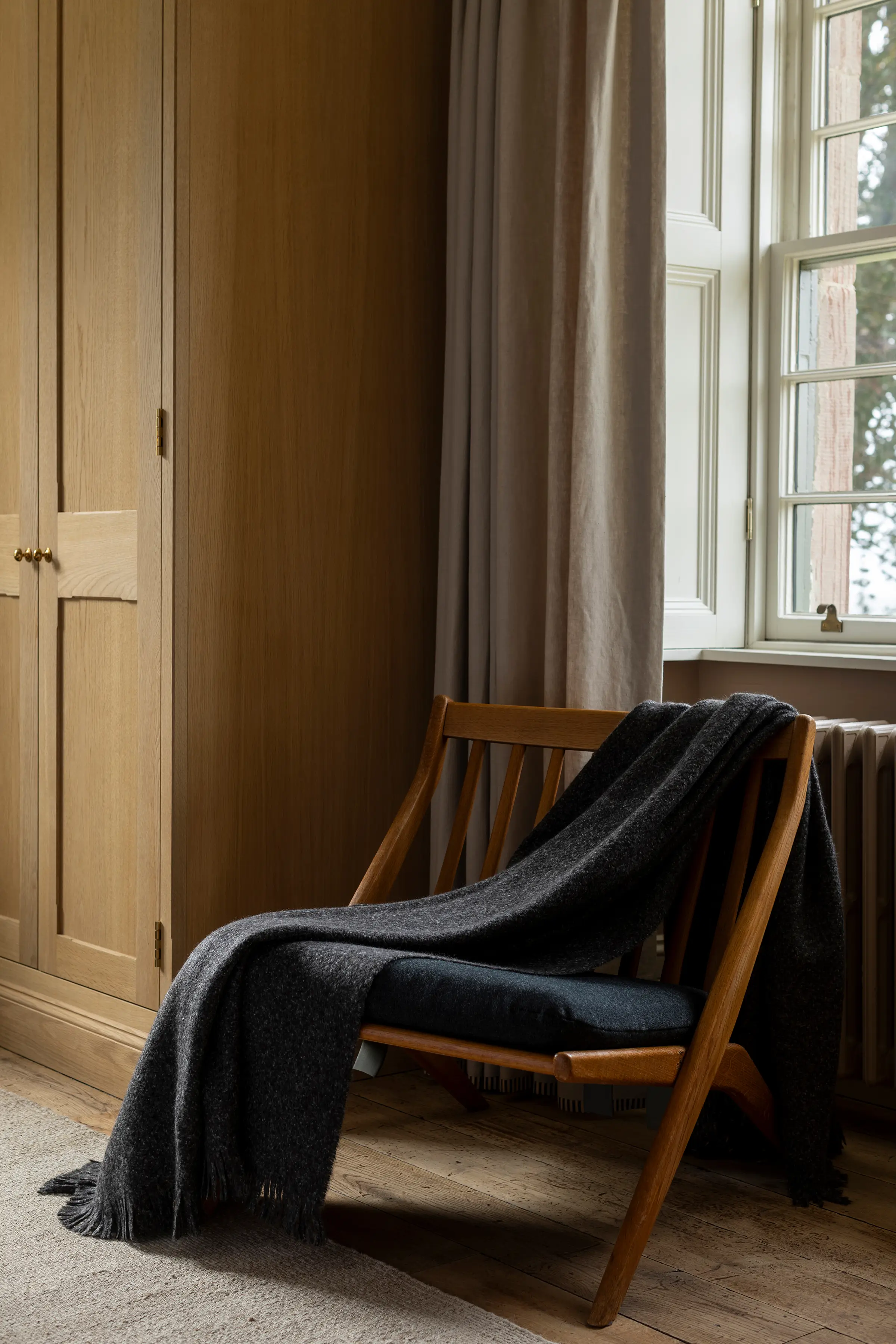 Our Brushed Charcoal Grey Cashmere Silk Bouclé Throw, crafted in our Scottish mill, is extraordinarily soft, light, and voluminous. Made from a luxurious blend of cashmere and silk bouclé yarn, it offers exceptional warmth and comfort. Perfect for adding a touch of elegance and cosiness to any space.
