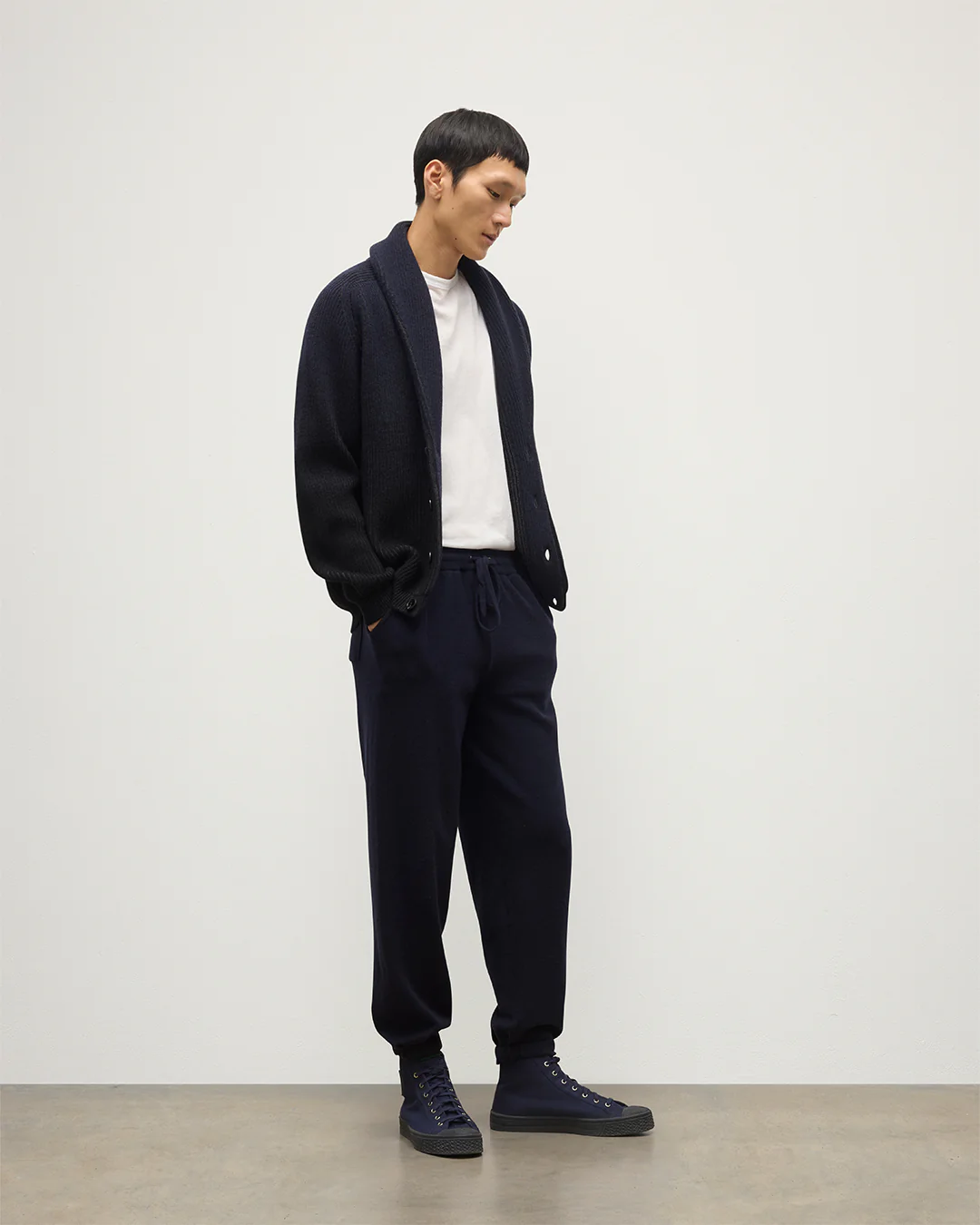 The Kirk Sweatpants in Dark Navy are knitted in our Hawick Mill from 2-ply yarns of our cashmere blend, combining exceptional natural softness with enhanced durability. Featuring a tapered leg, elasticated waistband and cuffs and front and back pockets, they’re perfect for elevated loungewear or casual styling with knitwear and trainers.