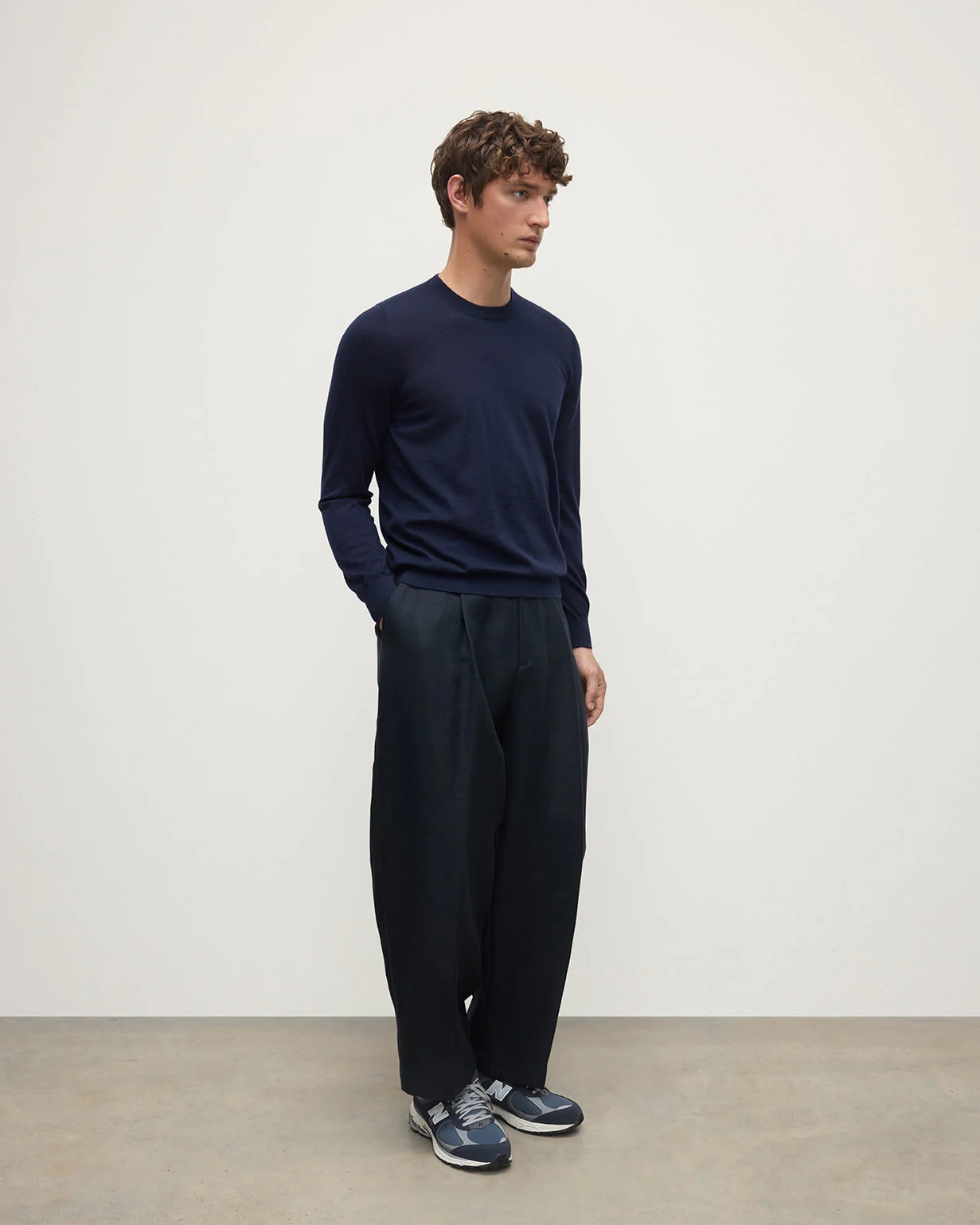 This slim-fit, round neck design is one of our year-round classic sweaters, made from a feather-light, superfine 3-ply yarn of 100% cashmere, knitted in our Hawick Mill. Dyed in an easy-to-style Dark Navy, it's a perfect layering piece throughout the seasons.