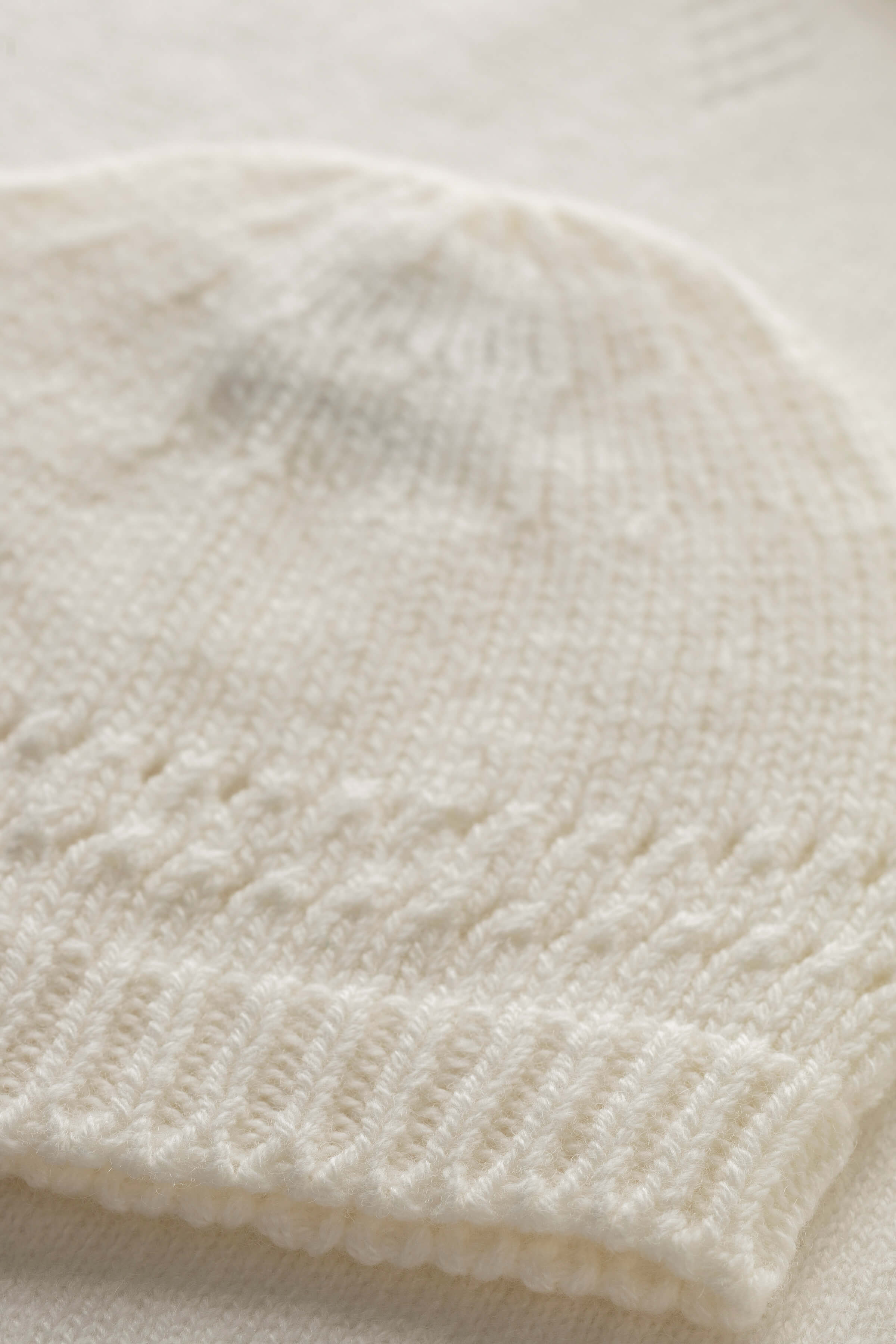 Soft, warm, and ideal for newborns. Made from whisper-soft white cashmere with a gentle ribbed finish for a snug fit. Expertly hand-knitted for comfort - a timeless gift for any little one.