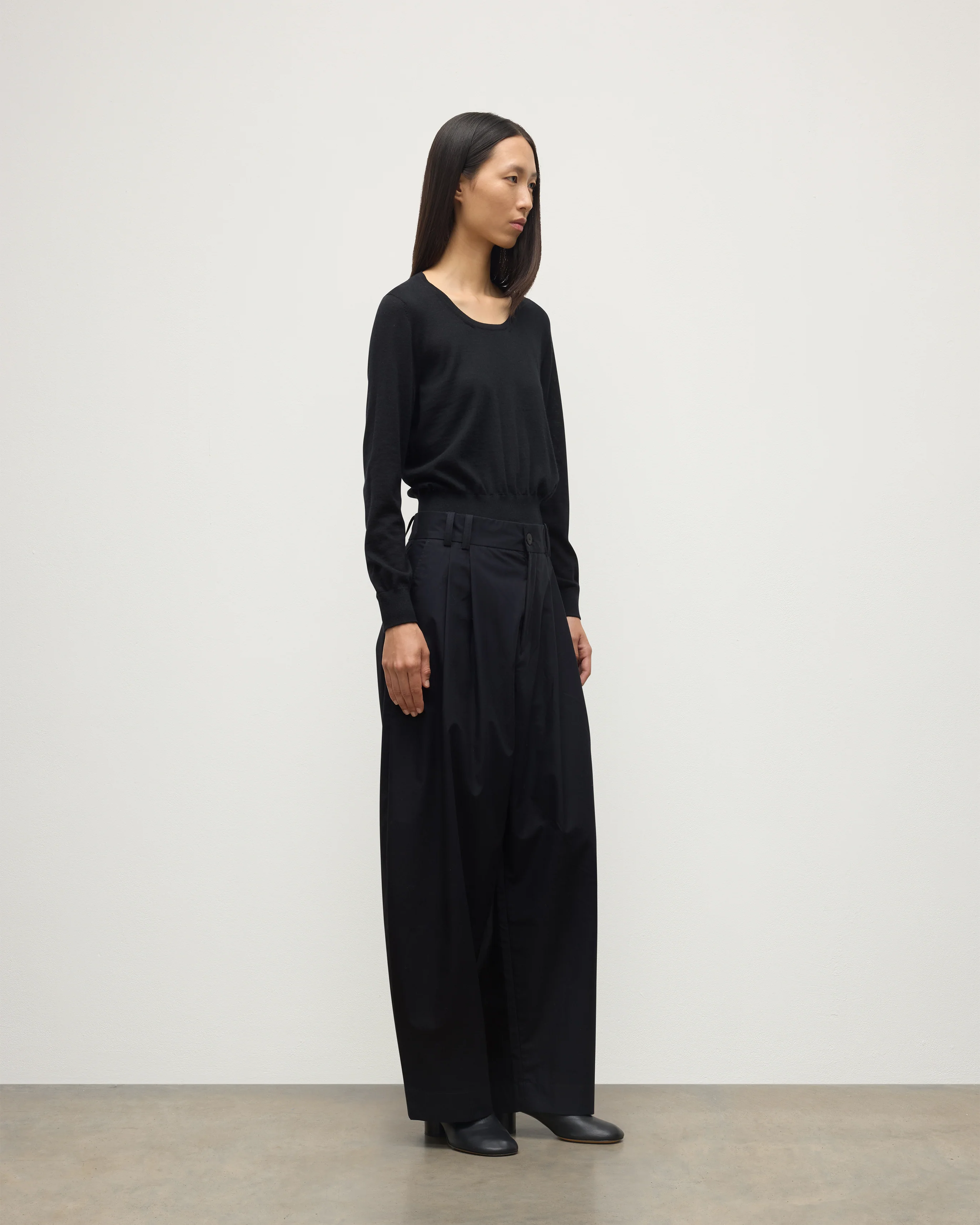The Ella in Black is a scoop neck jumper with a cropped fit, cut to sit at the hip rather than the waist. The length works well with tailored trousers and skirts, or tucked into high-waisted pieces, giving it a more considered silhouette.