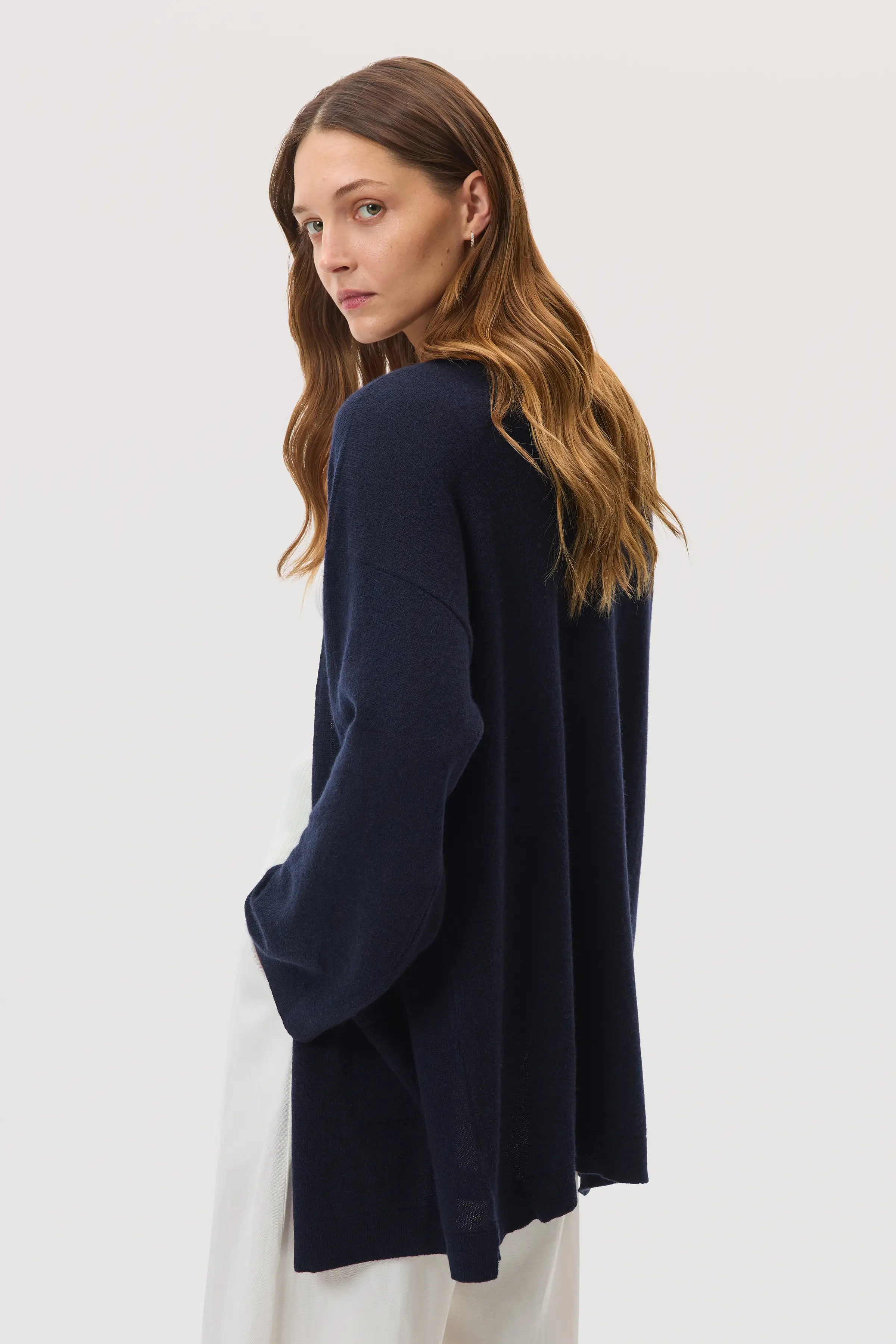 A relaxed, open-front cardigan for easy summer layering. Unstructured with wide kimono sleeves and made with gauzy, jersey-weight dark navy Cashmere. A generous silhouette, with pockets, that stops just above the knee.