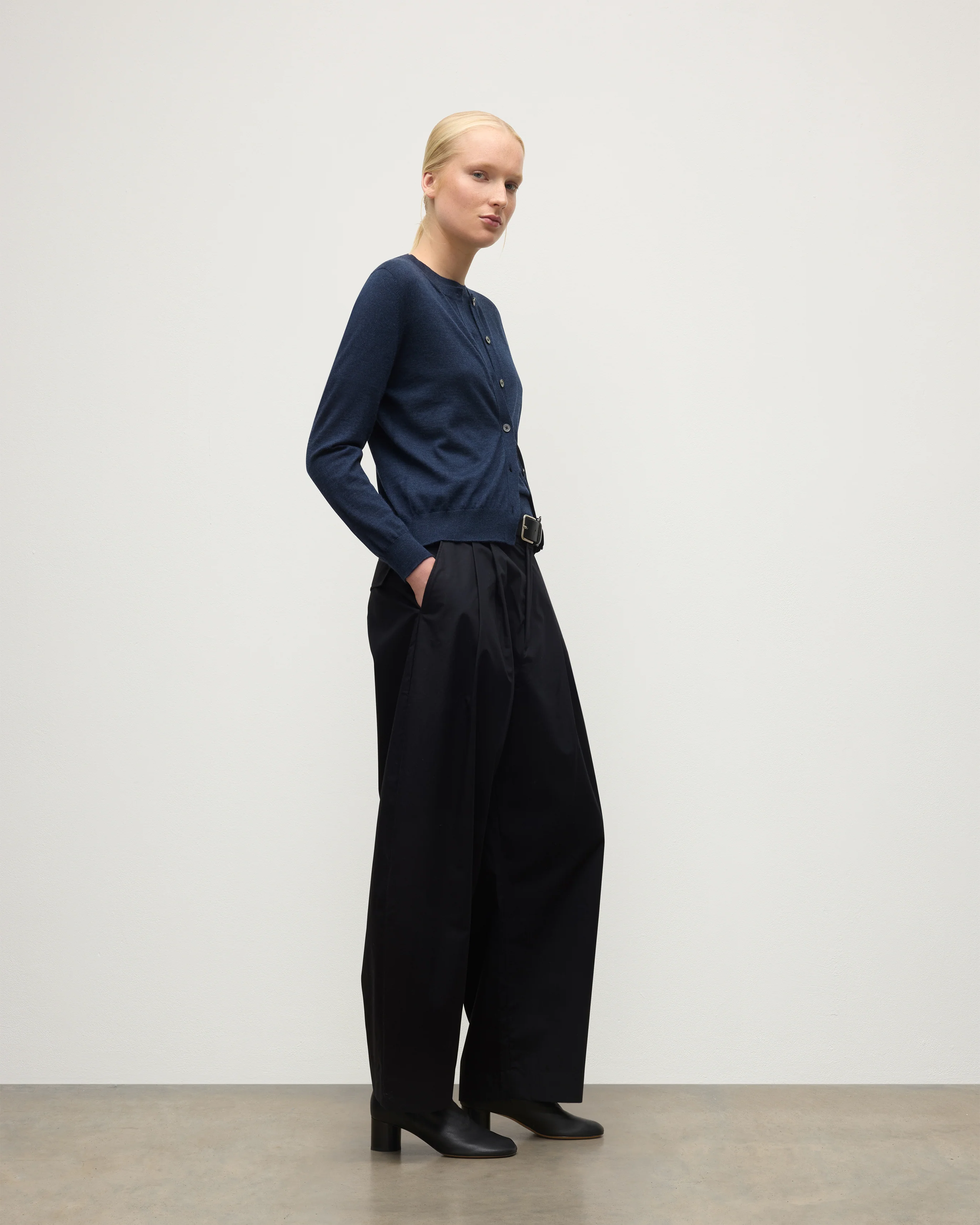 The Honor Cardigan in Cullen Grey is a lightweight, understated layering piece with an elegant Mother-of-Pearl button-through design, with our signature 'bee' motif etched onto the final button.