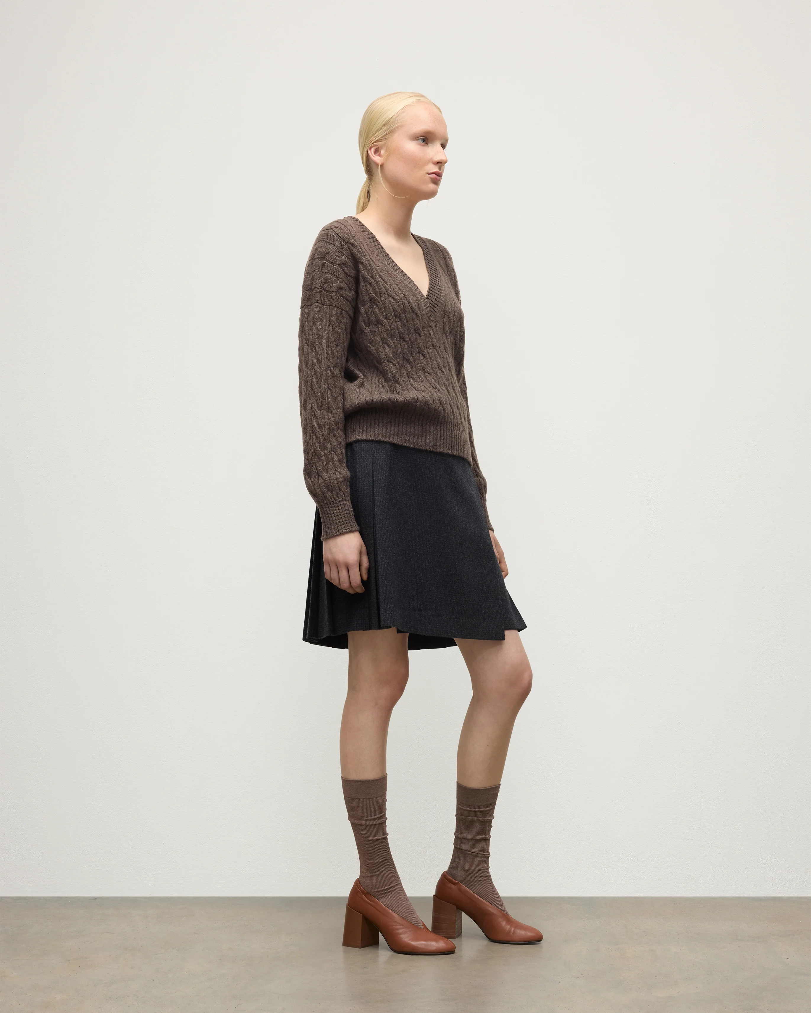 The Kylesku Jumper in Vole Brown is a modern interpretation of a classic V-neck silhouette, featuring a plunging V-neckline and relaxed fit with drop shoulders. Crafted in our Hawick Mill from the finest 2-ply 100% cashmere, this jumper comes in a classic cable-knit design.