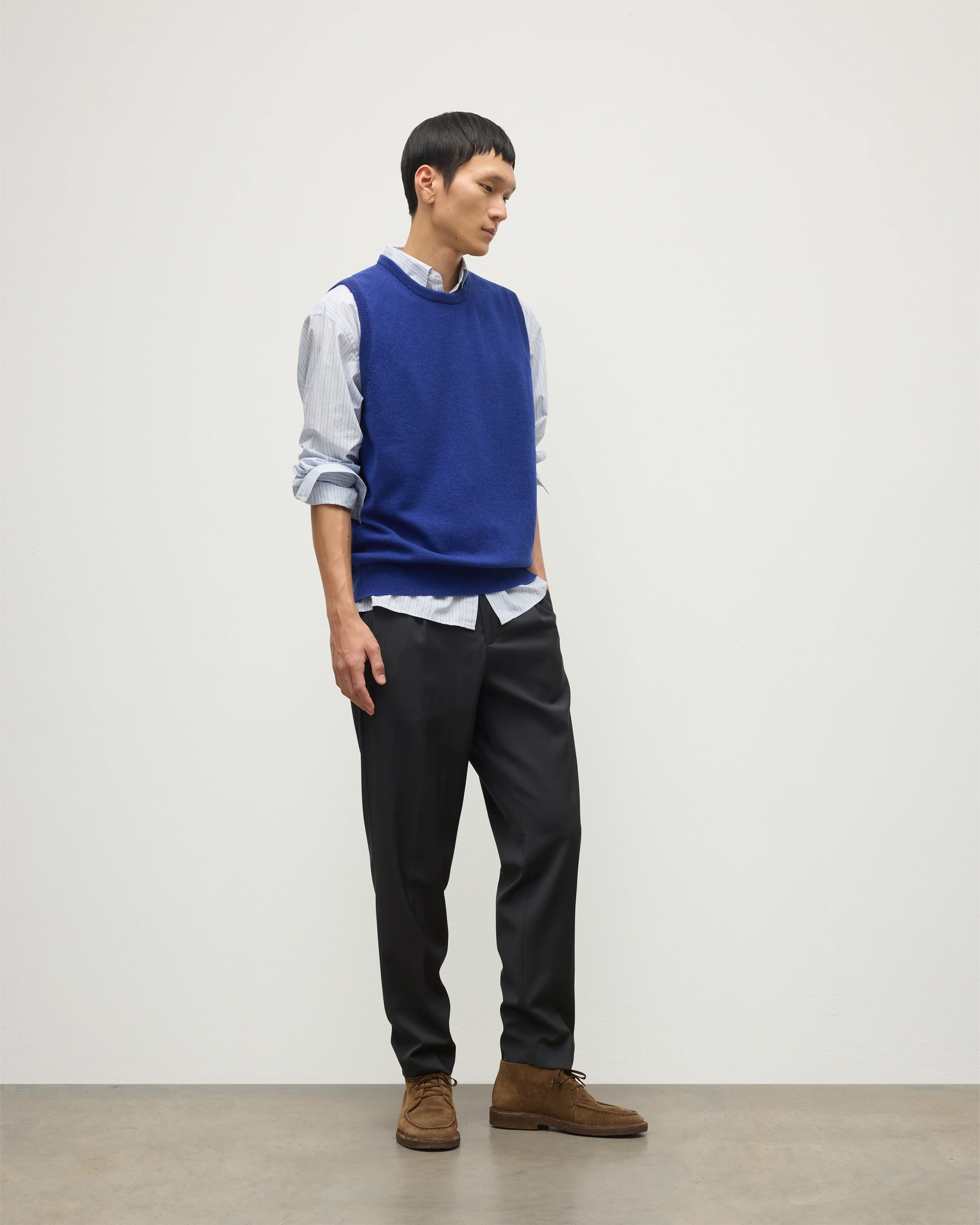 The Lennox in Ronay Blue is a modern layering piece with a clean, minimalist silhouette. Its sleeveless design featuring a ribbed crew neck, hem and arm holes. Knitted in our Hawick Mill from 100% 2-ply cashmere, this tank offers a smooth texture and natural breathability. The fine yarn ensures a lightweight feel that transitions between seasons.