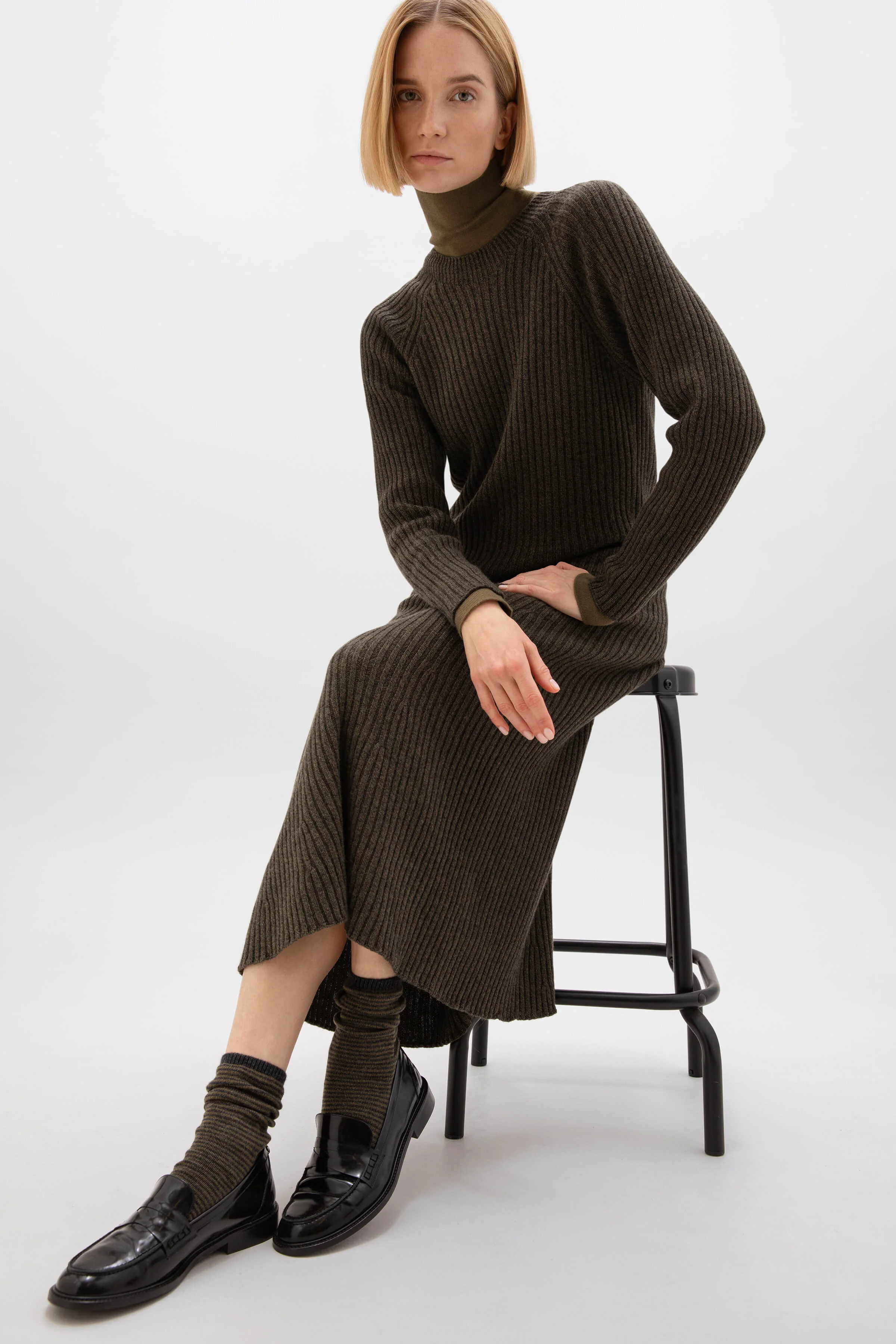 An indulgent cashmere dress based on one of our most popular men's sweater designs. Dolman sleeves feel relaxed and loose, while the long length is perfectly on-trend. A round neck, raglan sleeve piece in Autumnal olive green. Seamless, with deep arm openings and a fit and flare silhouette.