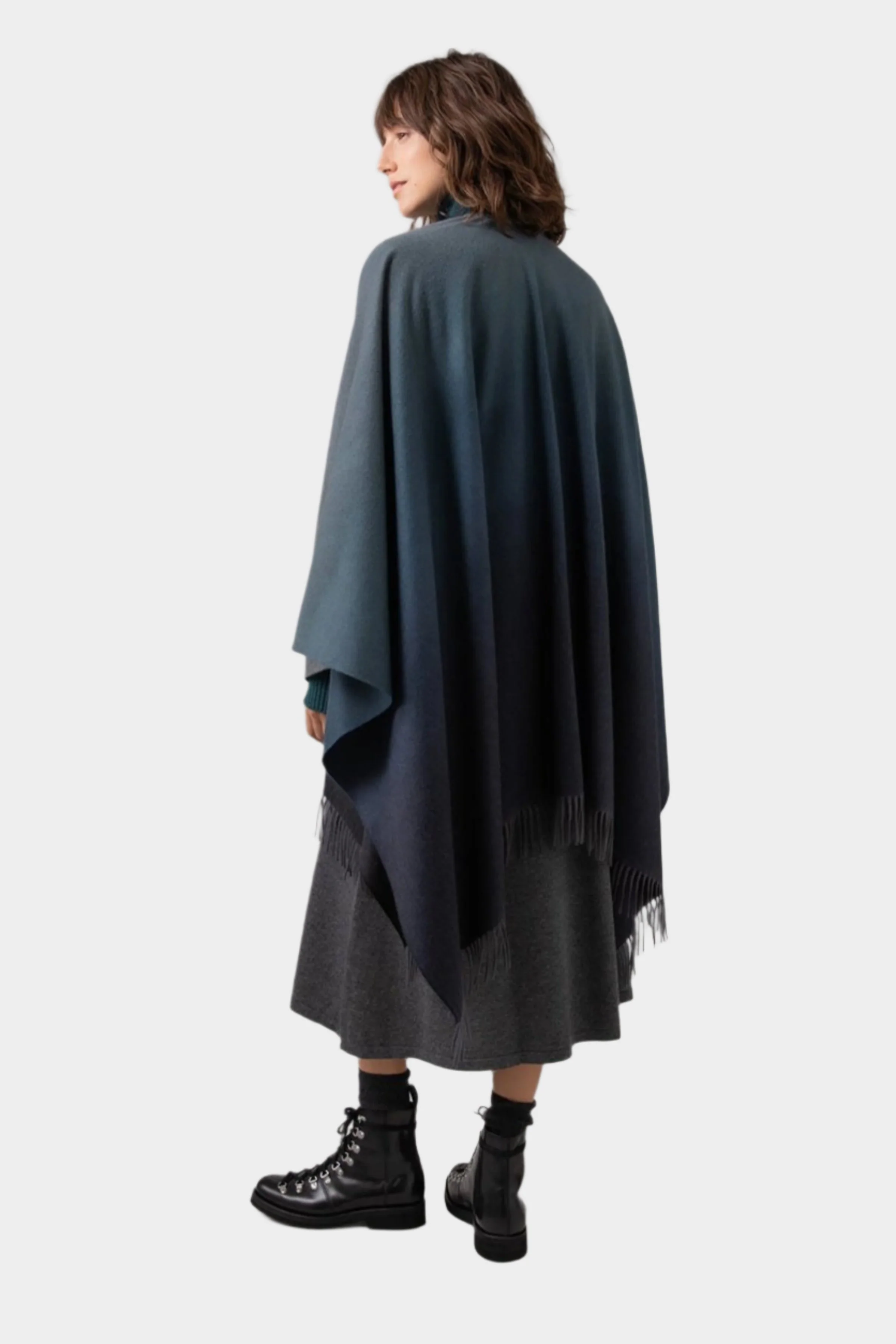 Navy to Mallard green Ombré Pure Cashmere Cape - we make our iconic Ombré pieces from start to finish in our own mills. We produce and dye our own yarn and blend numerous colours to achieve our signature rich ombré shades.